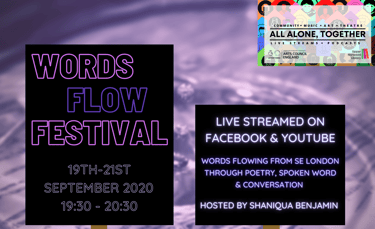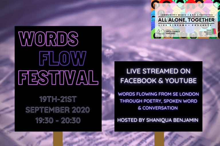 Words Flow Festival was a mini poetry and spoken word festival held at Upper Norwood Library Hub over three nights in September 2020. It showcased the voices and talents of poets and spoken word artists.